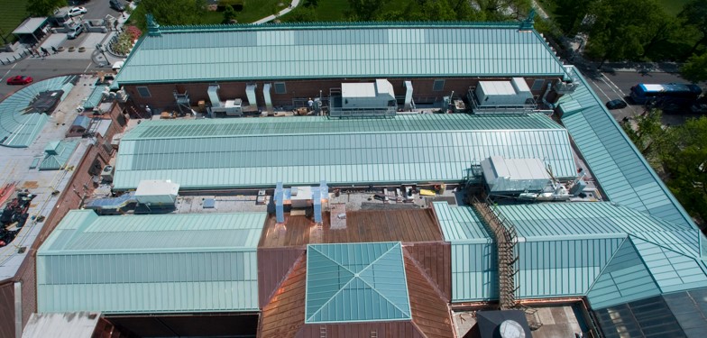 Linel designed a historic profile skylight system to replicate the original skylights on this 115-year-old building. The new skylight system utilized insulated glass units with a total of five different frit patterns and two DuPont white PVB interlayer sheets to control daylighting levels. Linel's in-house paint services created a custom exterior paint finish, patina copper, that matched the color of the existing aged copper roofing. Additional challenges during installation were met as the Installation team chased the demotion team so closely there was only a very small seam at the end of each day. Construction schedule was also arranged to occur over each gallery during the change between museum exhibits.